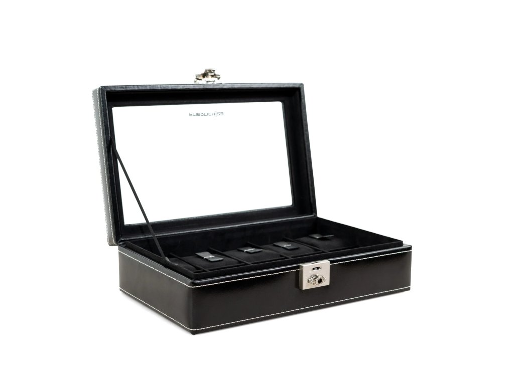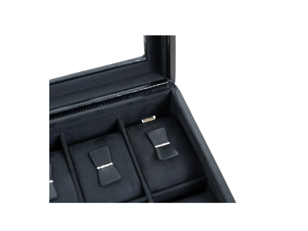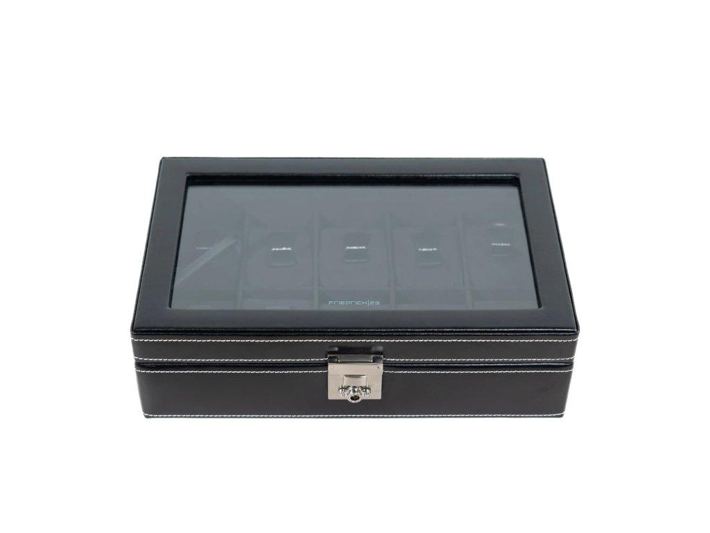 V tomto kufríku budú vaše cenné hodinky bezpečne uložené a chránené pred prachom, vibráciami a inými vplyvmi prostredia. V súlade s ušľachtilým obsahom sú elegantné kufríky vyrobené ručne z jemnej čiernej pravej kože vo vysokej kvalite. Velúrová podšívka s mäkkým povrchom je ideálna pre ochranu hodnotného obsahu kufríka, ktorý  je uzamykateľný. Veko so sklom, aby ste mali prehľad o svojej zbierke.