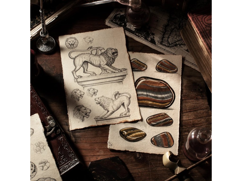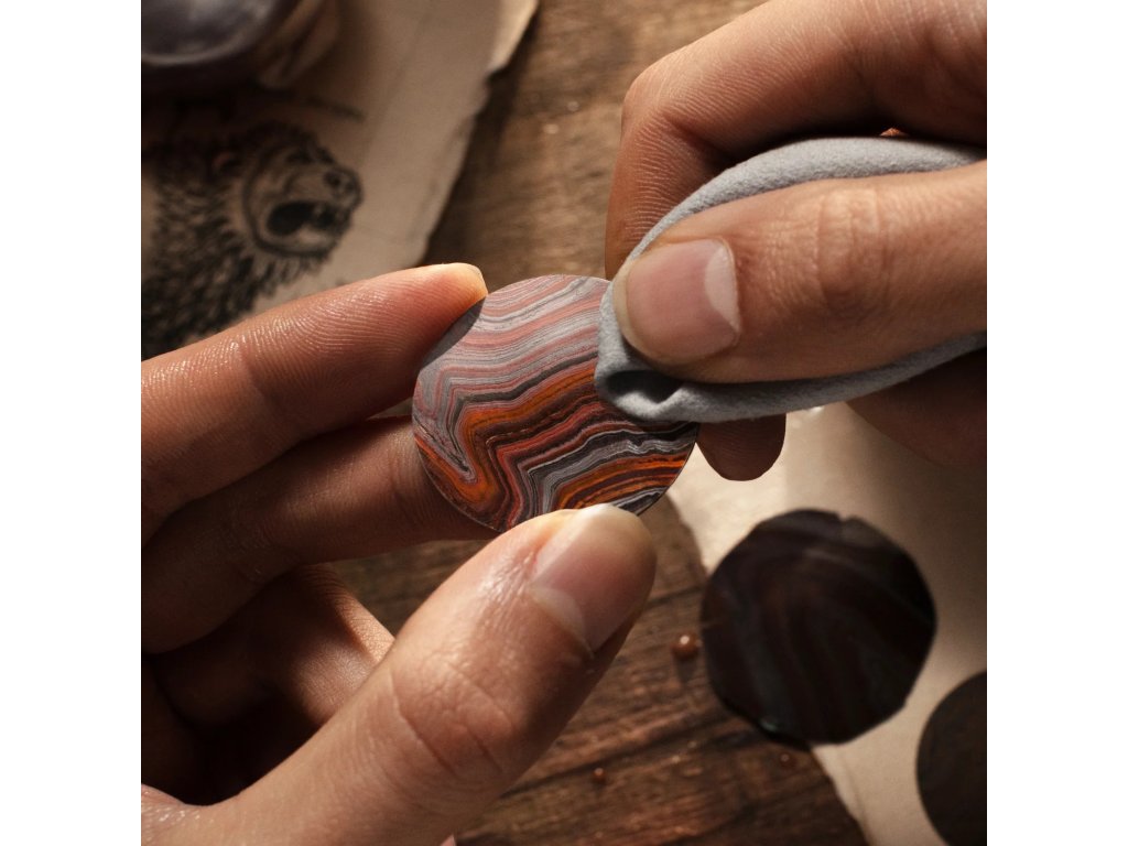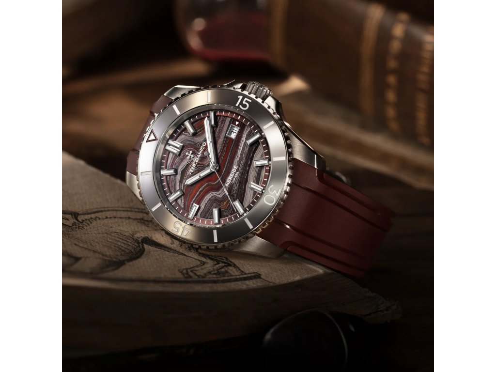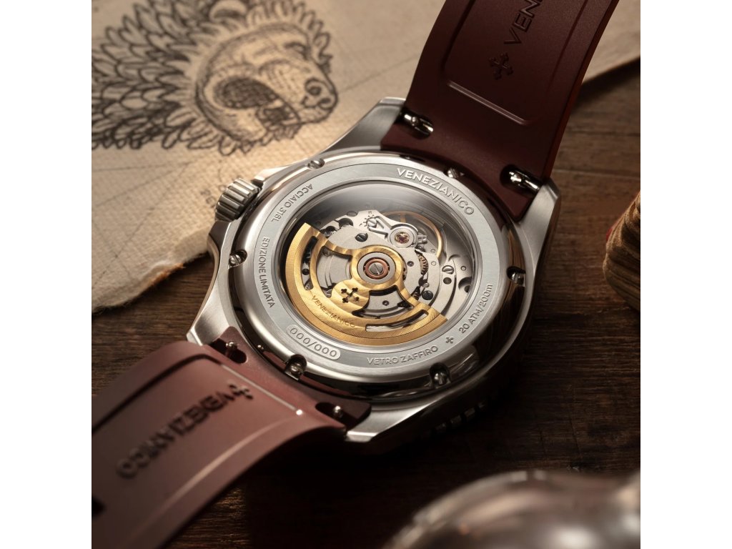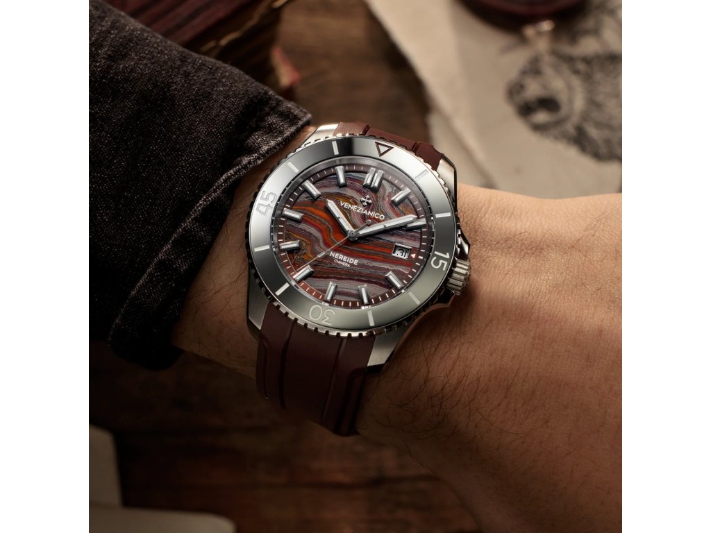 Nereide Chimera skúma myšlienku spojenia rôznorodého materiálu. Ciferník je vyrobený zo vzácneho kameňa Iron Tiger, kompozitného kameňa prirodzene vytvoreného splynutím tygrieho oka s červeným jaspisom a hematitom, kde sa rôzne minerály spájajú do jedného povrchu definovaného prirodzenými stratifikáciami a vizuálnou hĺbkou. Názov Chiméra odkazuje na toto materiálne spojenie a na širší kultúrny odkaz zakorenený v Benátkach. Okrídlený lev, symbol mesta, je sám o sebe chimérou: postavou zloženou z rôznych jedincov spojených do jednej formy. Rovnako Iron Tiger spája odlišné minerály do jedného materiálu.